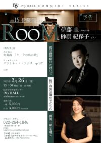 IVy HALL【ROOM】#015 大崎耕土が生んだその大らかで豊かな音楽が魅力のNHK交響楽団クラリネット首席奏者の伊藤圭さんと、 「被災地へピアノをとどける会」にも多くの協力をしてくださったピアノの榊原紀保子さんがROOMに登場してくださいます。 2022年せんだいクラシックフェスティバルで委嘱された吉川和夫さんの変奏曲「キーウの鳥の歌」の再演も。名手の共演をお楽しみください!