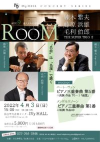 ⅣyHALLコンサートシリーズ【ROOM】の1周年を記念して、日本を代表する室内楽の達人TRIOが再登場!日本の音楽界に多大なる貢献と功績を残してきた「盟友」たちによる夢の共演を至近距離で大いに満喫してください!